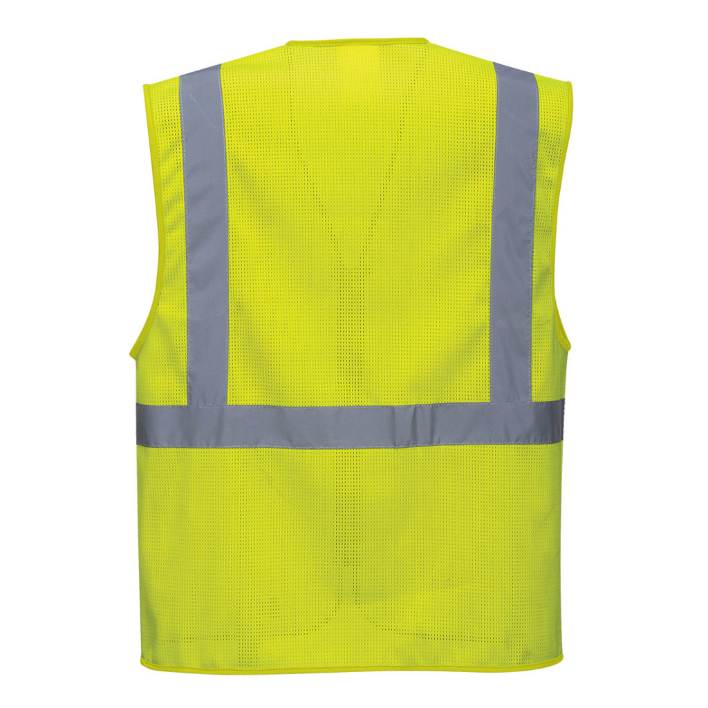 MeshAir technológia garantálja a kiváló légáramlást viselőjének. A MeshAir alapanyag megfelel az EN ISO 20471 szabványnak. A mellény további funkciói: praktikus zsebek, ID kártya tartó, rádió hurok, cipzáras záródás, lélegző hálós szövet.