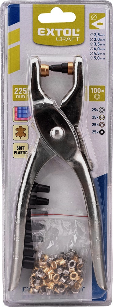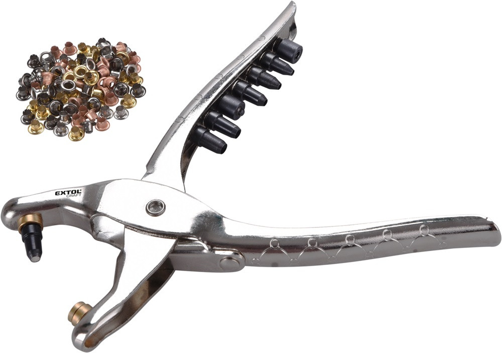 EXTOL CRAFT bőrlyukasztó klt.; fogó 225mm + 6 db lyukasztó fej: 2,5-3,0-3,5-4,0-4,5-5mm + 2 db szegecselő fej + 100 db szegecs