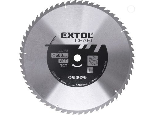 EXTOL CRAFT körfűrészlap, keményfémlapkás, 500×30mm(lyuk átm), T60; 3,8 mm lapkaszélesség, max. 3.000 ford/perc