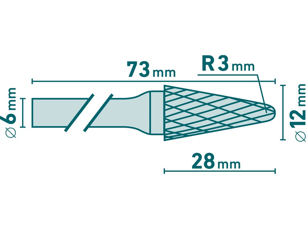 EXTOL INDUSTRIAL keményfém turbómaró (rotormaró), kúpos, kerek orrú, átmérő 12×28mm/szár 6mm, keresztfogazás