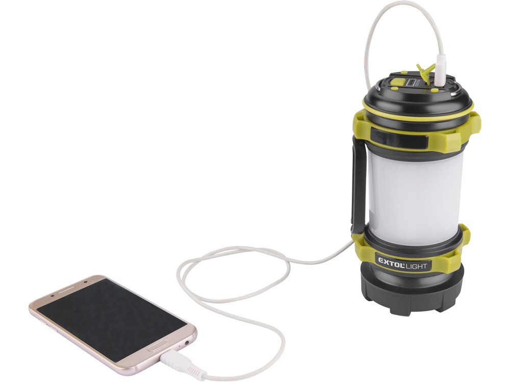 EXTOL LIGHT LED lámpa, tölthető; 350 Lm, cserélhető Li-ion akku, 2600 mAh, powerbank funkció, cseppálló