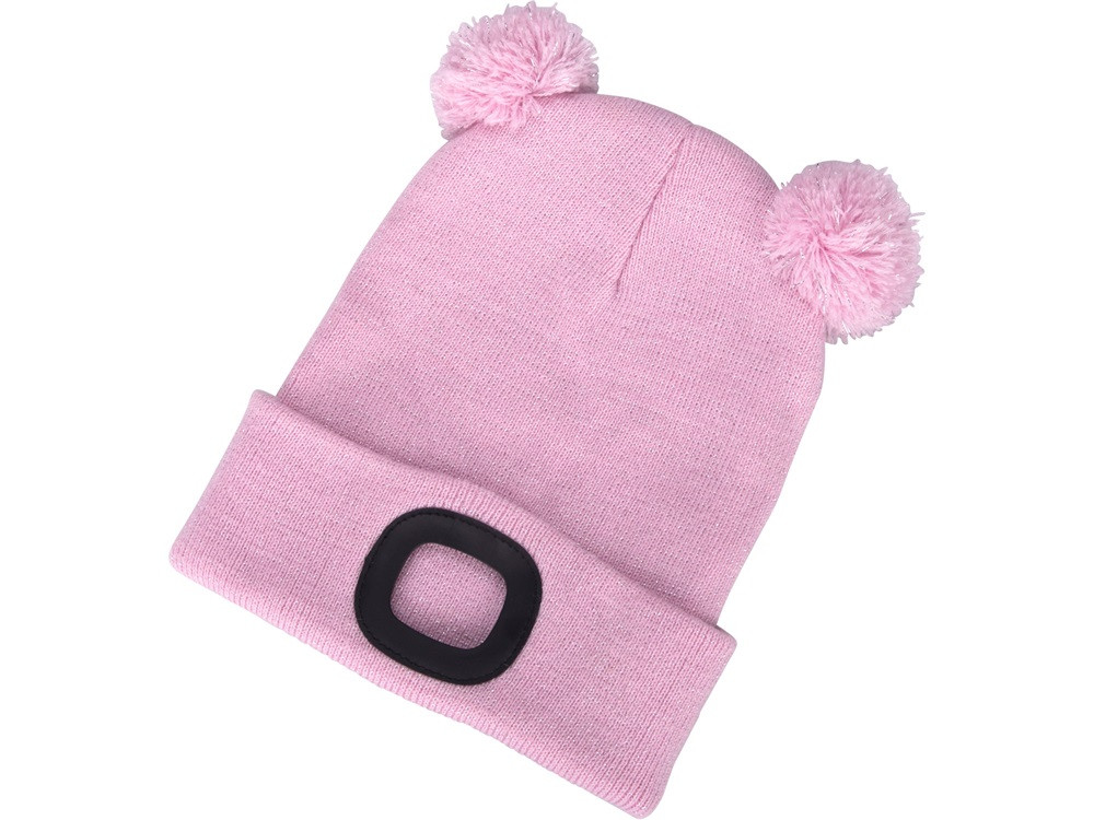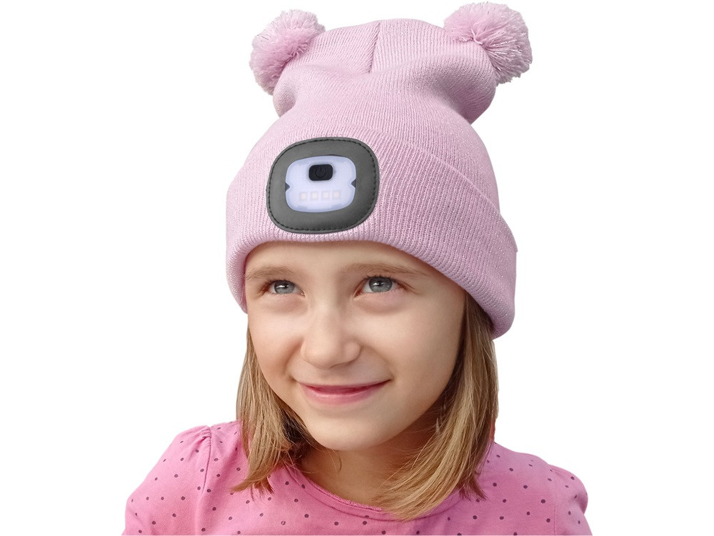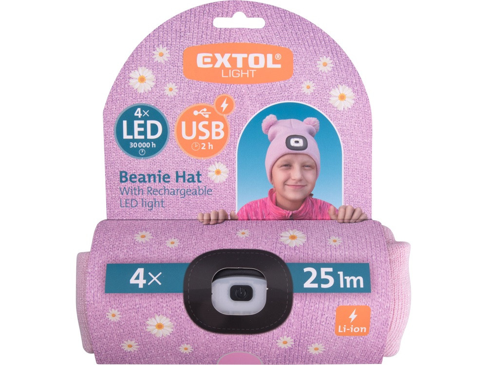 EXTOL LIGHT sapka, gyerek, rózsaszín, kötött, kivehető LED homloklámpával, 4×25 Lumen; USB tölthető Li-ion, 3funkció (100%-75%-50%)