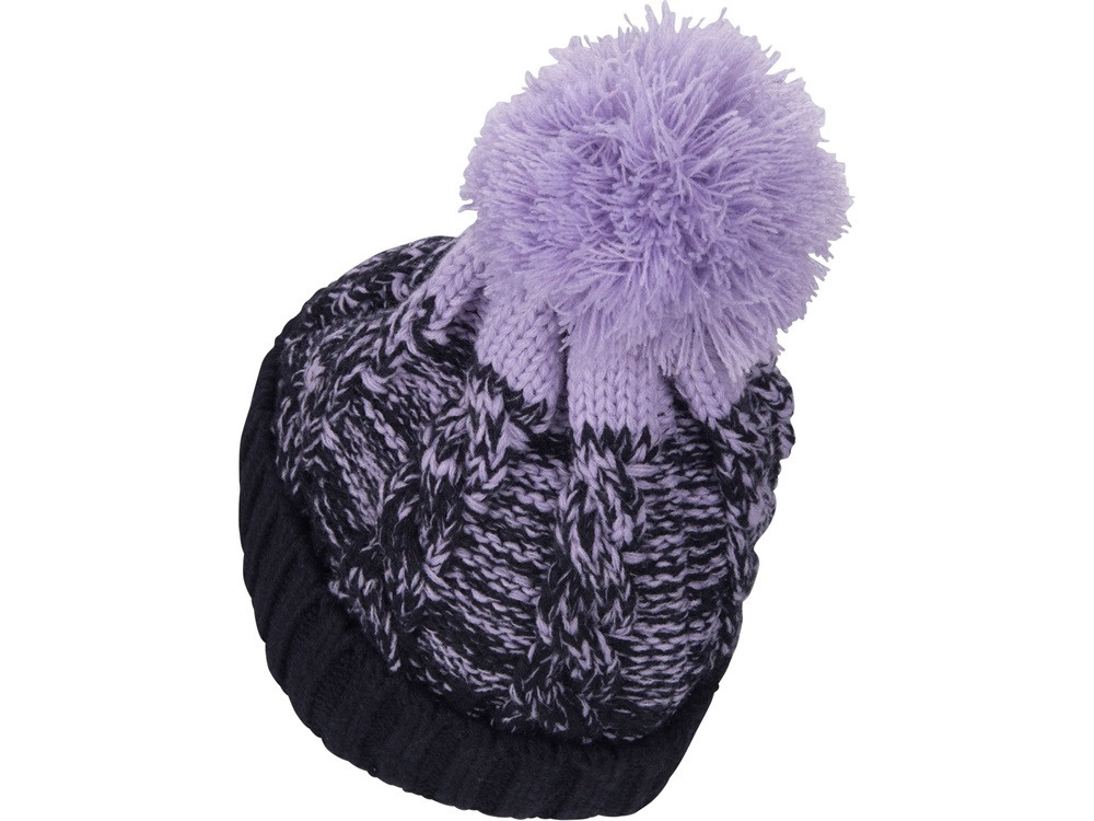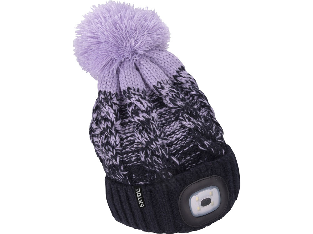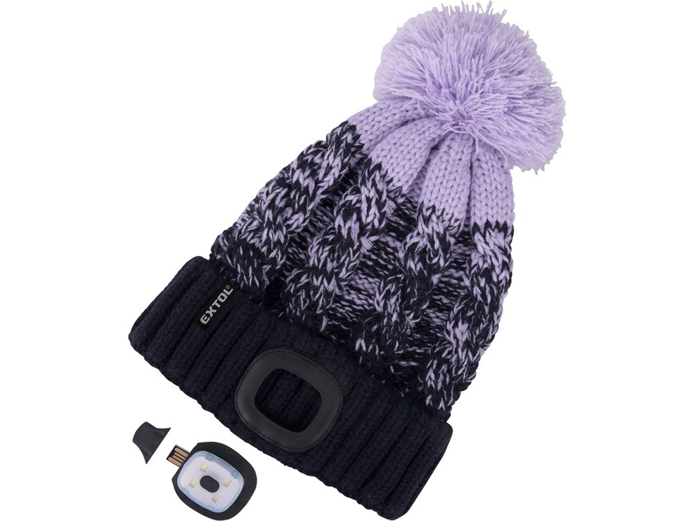 EXTOL LIGHT sapka, kék/lila pomponnal, kötött, kivehető LED homloklámpával, 4×45 Lumen; USB tölthető Li-ion, 3funkció (100%-75%-50%)