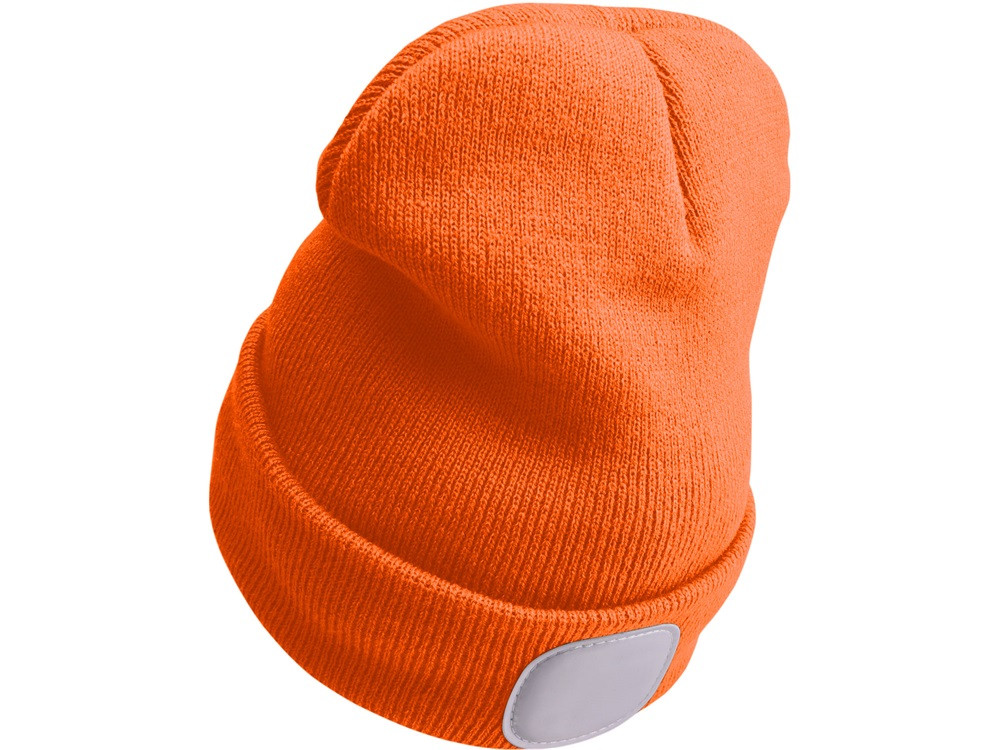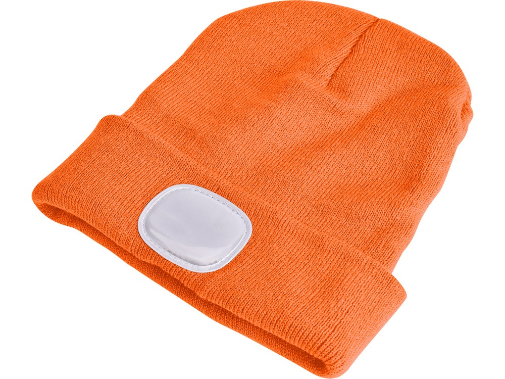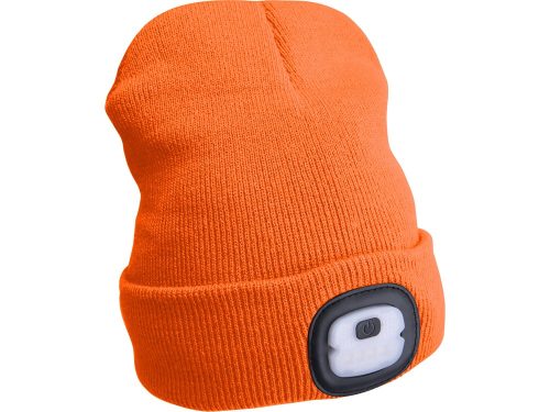 EXTOL LIGHT sapka, neon-narancs, kötött, kivehető LED homloklámpával, 4×25 Lumen; USB tölthető Li-ion akku, 3funkció (100%-75%-50%)