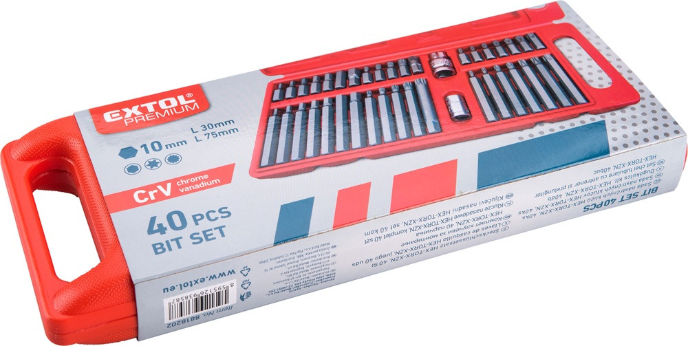 EXTOL PREMIUM bit klt. 40 db HEX-TORX-XZN, 10mm, adapter 3/8" és 1/2", CrV, műanyag dobozban
