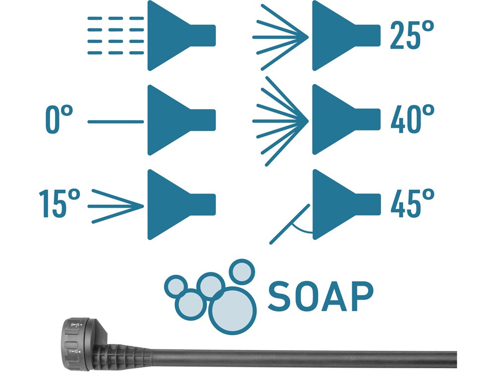 - A forgatható fúvókának köszönhetően a készülék 6 különböző alakú vízsugarat tud előállítani. A készülék így nem csak nagynyomású mosáshoz, hanem például növények öntözéséhez vagy felületek zuhanyoztatásához is használható. Az oldalirányú vízsugárral autók sárvédőjét vagy a karosszéria tetejét is kényelmesen le lehet mosni.