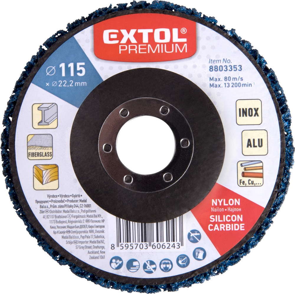 EXTOL PREMIUM csiszolókorong sarokcsiszolóhoz ("négertárcsa"), 115mm, 14 mm vastagság, üvegszálas hátlap, nylon és szilícium karbid