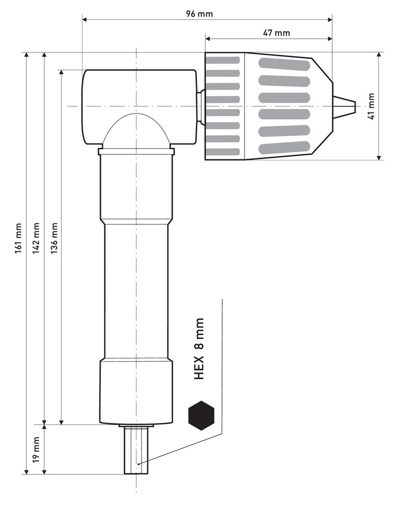 EXTOL PREMIUM gyorstokmány, L-alakú, befogás: 0,8-10mm, csatlakozás 3/8", 24UNF (sarokfúró adapter)