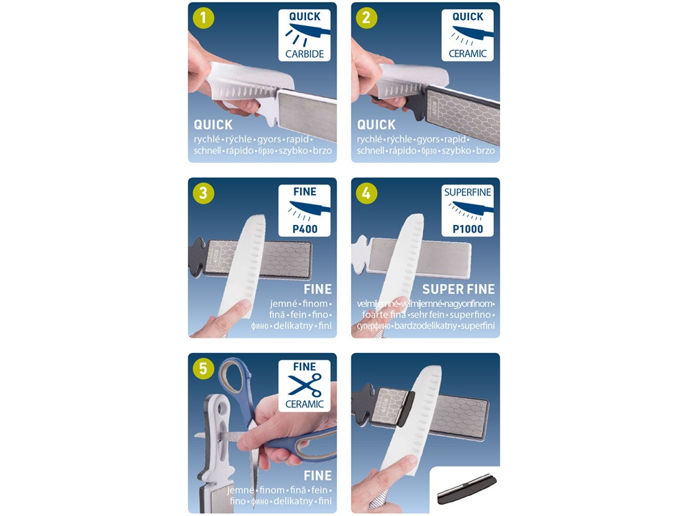 • Műanyag-kerámia vezetővel van ellátva, amely segít fenntartani az állandó penge-csiszolási szöget az élezés során.