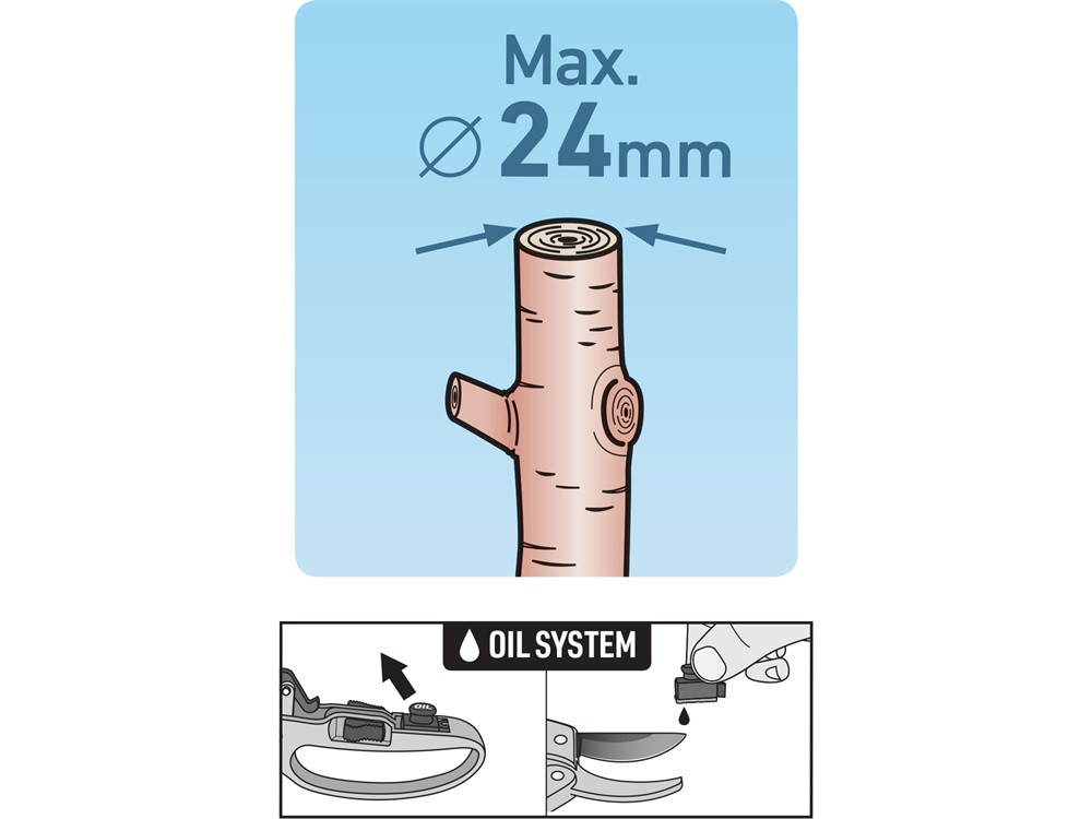 A racsnis szerkezet csökkenti a működtetéshez szükséges kézi erőt és növeli a max. átvágható ág átmérőt. Teflon bevonatú, tapadásmentes SK5 acél vágóél, max. 24 mm vágási kapacitás. A nyélben beépített olajtartály található: a rendszeres olajozás növeli a várható élettartamot.