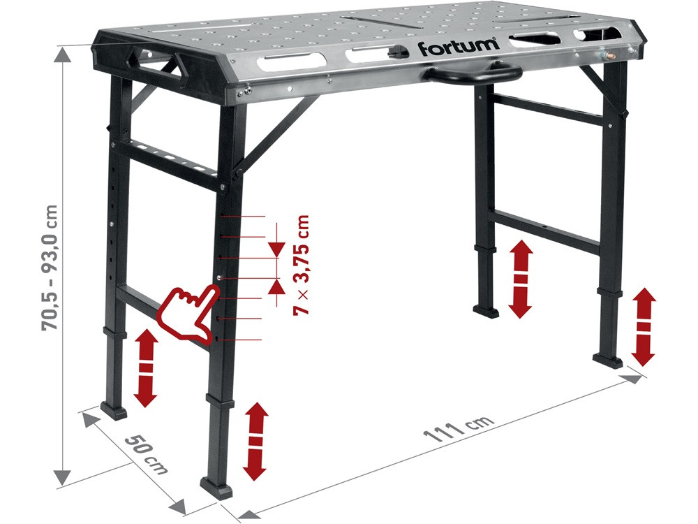 A könnyű, mégis masszív, hordozható FORTUM hegesztő pad 1068 × 532 mm-es horganyzott acélból készült, állítható magasságú munkafelületet biztosít, számos kivágással a rögzítők számára. Az asztal terhelhetősége 454kg .