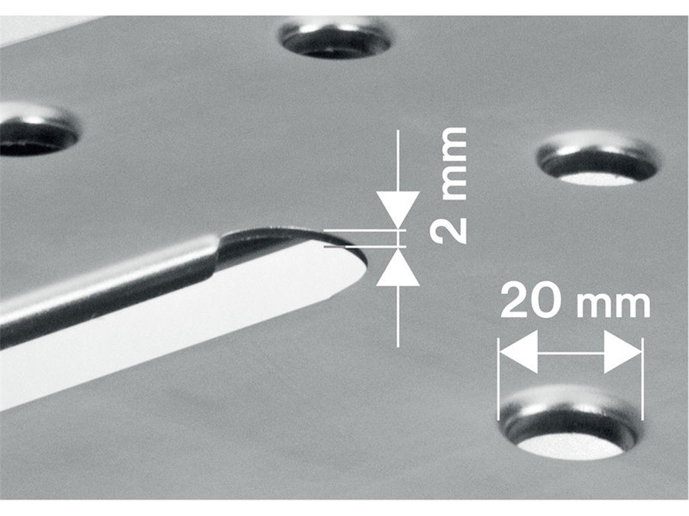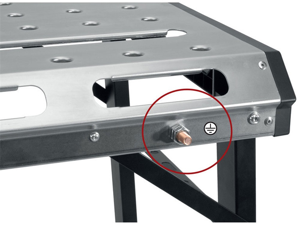• a szilárd fémkonstrukció és a 2 mm vastag horganyzott acéllemezből készült, alig 107 x 53 cm-es munkafelületnek köszönhetően az asztal maximális terhelhetősége 454 kg, a munkalapban vannak hosszúkás nyílások és 20 mm-es furatok a rögzítő/támasztó ütközők vagy szorítóbilincsek számára