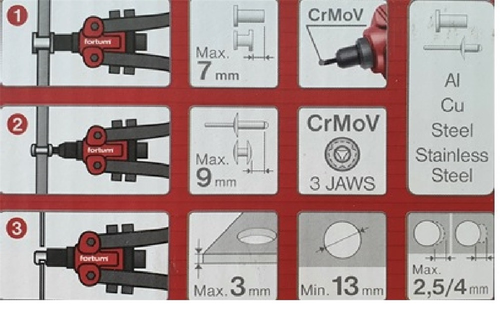 FORTUM szegecsanya- és popszegecshúzó fogó, 3az1ben, kétkaros; 260mm, CrVMo fej, FORTUM