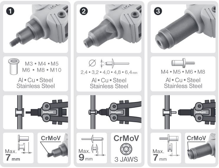 FORTUM  szegecsanya-, szegecscsavar- és popszegecshúzó fogó, 3az1ben, kétkaros; 325mm, CrVMo fej, FORTUM