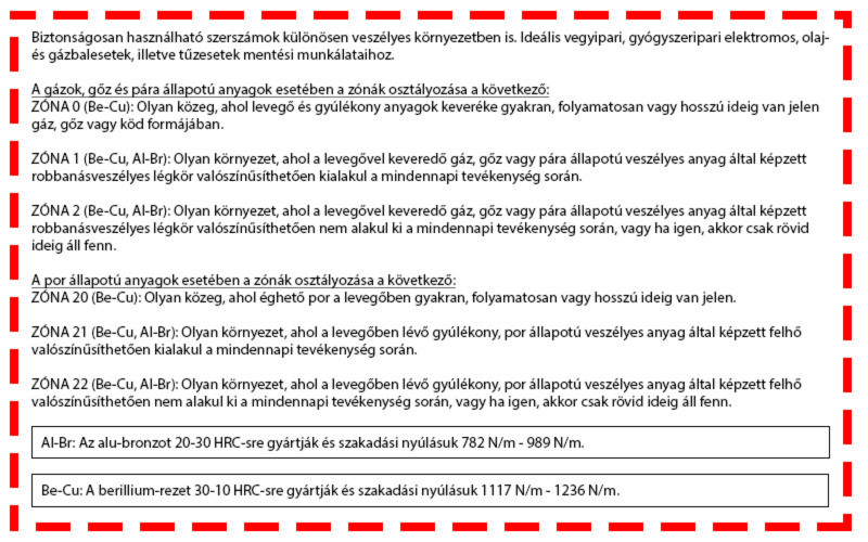 • Ezek a szerszámok a normál kivitelű szerszámokkal ellentétben nem képeznek szikrát kemény felülethez történő ütés következtében.