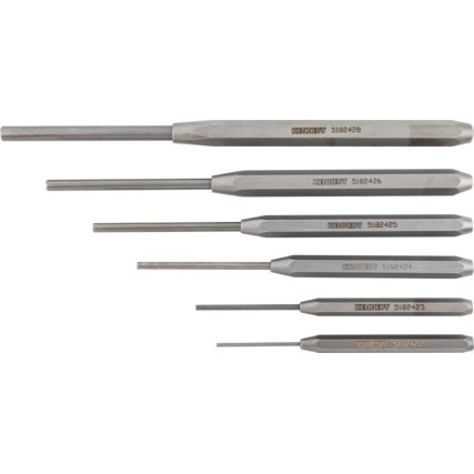 Króm-vanádium acélból készült. Csapszegek, illesztőszegek eltávolítására. Készlet tartalma: 2, 3, 4, 5, 6 és 8mm. Műanyag tokban kapható.