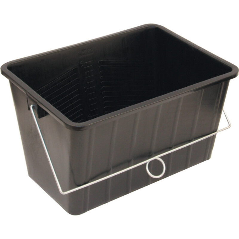 • Fekete műanyag festővödör fém füllel és peremmel a festőhenger rögzítéséhez.