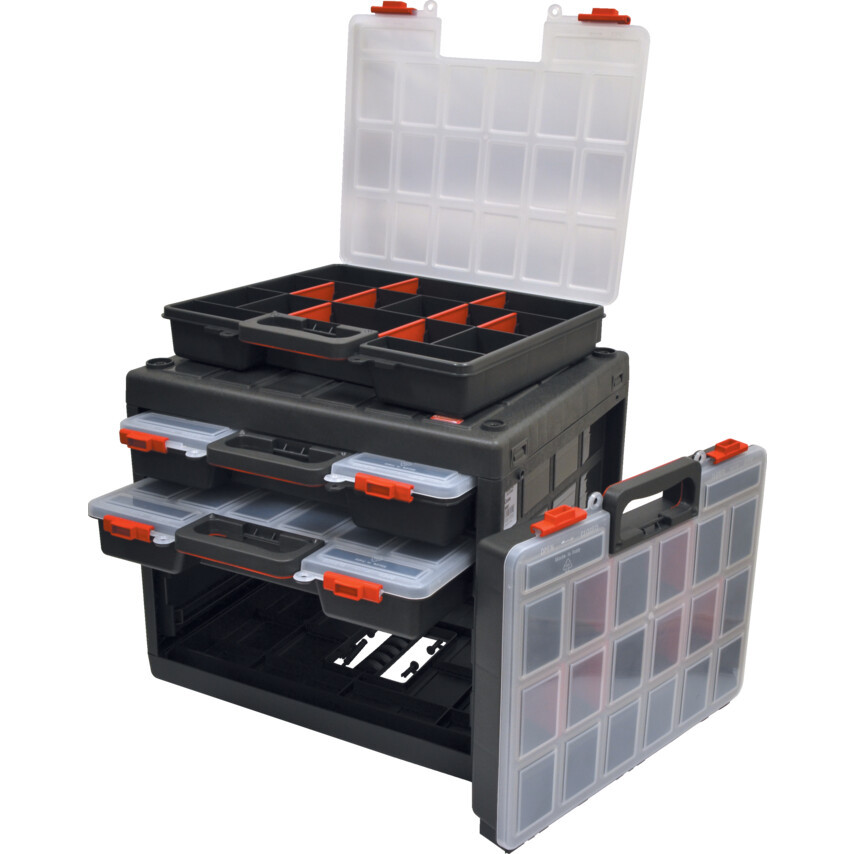 Robusztus tárolókeret négy darab egymásra helyezhet' tárolódobozzal. A dobozok külön zárhatóak és megemelve kihúzhatók. B'víthet' rendszer amely lehet'vé teszi további keretek hozzáadását. A dobozok átlátszó fedéllel és elosztólapokkal. Maximum 4 doboz tárolásához. Terhelhet'ség: 6 kg. Egyid'ben maximum három doboz tárolása ajánlott.