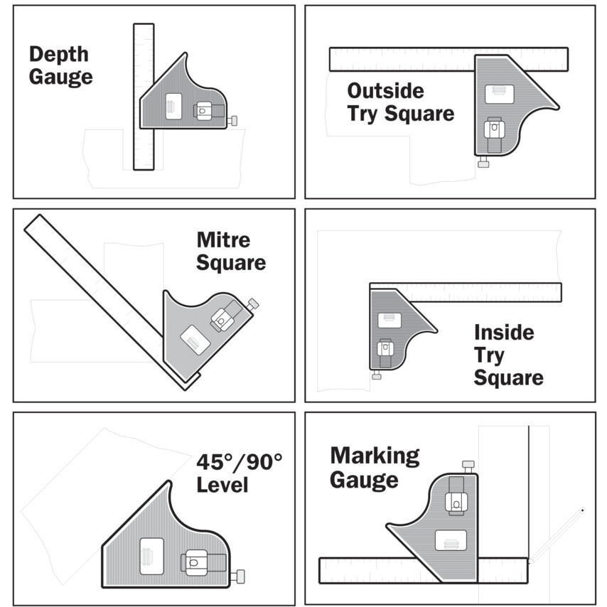 Többfunkciós. Használható derékszögként, szögjelölőként, vízszintezőként, mélység- és magasságmérőként stb. Jelölő szerszámmal szállítva. Alumíniumöntvényből készült fej 150 mm (6") hosszú acélvonalzóval illetve cinkötvözetből készült fej 300 mm (12") hosszú acélvonalzóval.