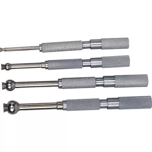 Ideális eszköz furatok, hornyok, beszúrások méréséhez. A matt krómozott recézett fogantyúval végezhetjük a furatmér' finombeállítását a munkadarabon belül. A mér'fej a nagyobb pontosság és hosszabb élettartam érdekében edzett. A bels' méret pontosításához használjunk mikrométert. A kis furatmér' mérési tartományát meghaladó méretű furatokhoz, hornyokhoz stb. használjuk a Kennedy teleszkópos furatmér'ket. A készlet tartalma: 90, 99, 110 és 110 mm teljes hossz.