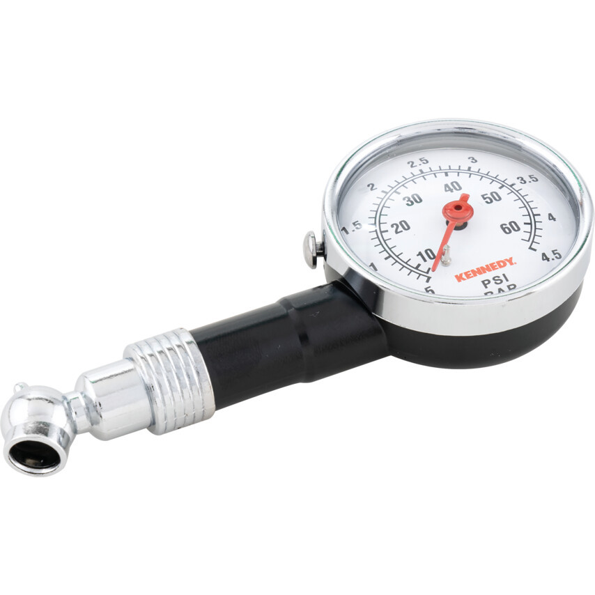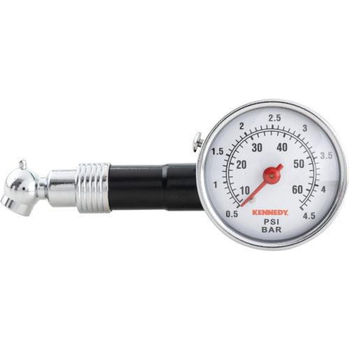 A biztonság érdekében a gumiabroncs nyomását hetente egyszer célszerű ellenőrizni hideg állapotban. (A gyártó ajánlása szerint). Órás gumiabroncs nyomásmérő kettős (psi/bar) skálabeosztással, 64 psi (4.5 bar) felső értékig. A mért értéket a kioldó gomb megnyom ásáig tartja.
