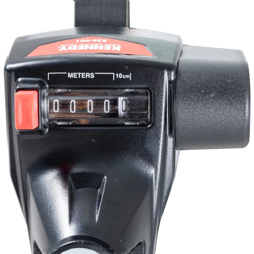 Masszív és könnyű kialakítás ütésálló kerékkel, szabadalmazott fogaskerekes átviteli szerkezettel és időjárásálló házzal. A behajtható alumíniumnyél automatikusan bekattan a kinyitott helyzetbe. Öt számjegyű számláló. 2 db visszaállító gomb. Rugós kitámasztó. Pontos hely jelölése. Markolattal működtetett fék. Hordtáskával.