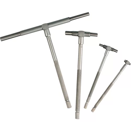 Recézett selyemkróm szár, edzett és köszörült mér'csapok bels' átmér'k pontos méréséhez, mikrométer használatával. Kisebb bels' átmér'k méréséhez használjuk a 3-13 mm mérési tartományú kis furatmér' készletet.