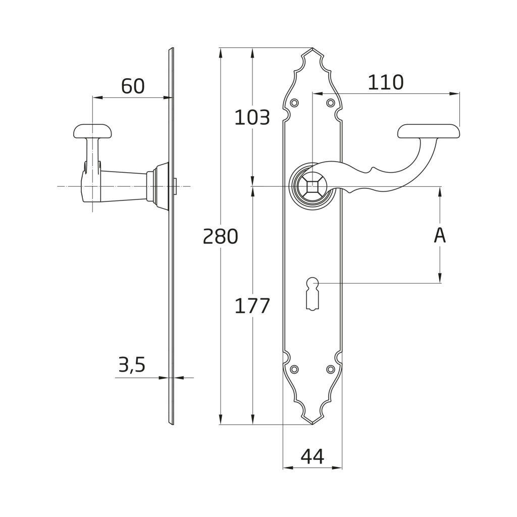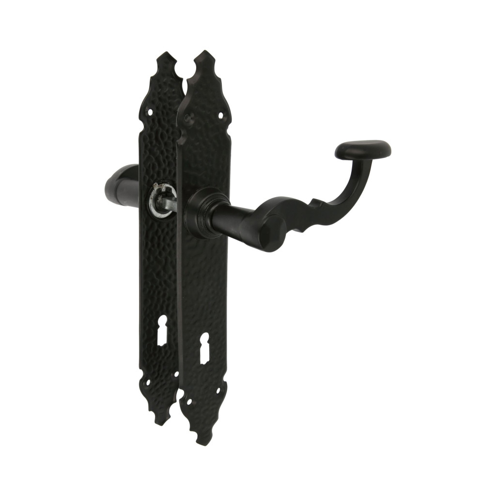 Kilincsgarnitúra festett fekete, 90mm kulcslyukas, rusztikus hatású