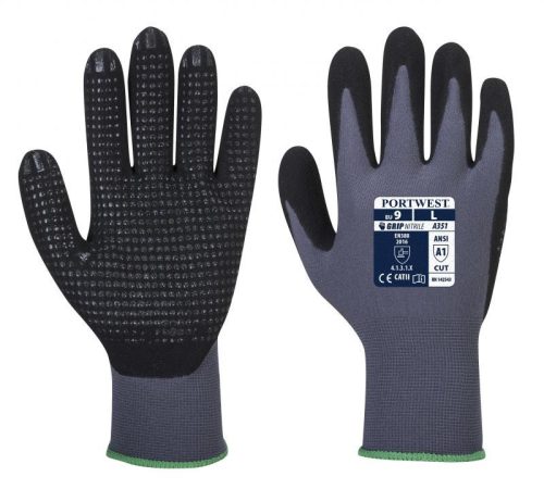 Az A351 pöttyözött tenyérrel rendelkezik, amely javítja a fogásbiztonságot és további tenyérvédelmet biztosít. A légáteresztő, varrás nélküli bélés ideális a száraz környezetben történő precíz kezeléshez.