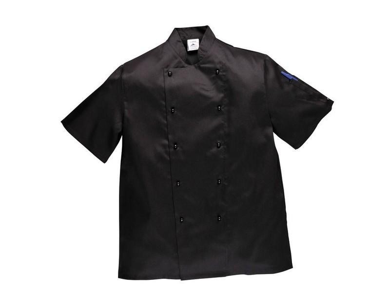 Alapanyag: 65% poliészter,35% pamut 190g.Meleg munkakörnyezetre tervezett rövidujjú séfkabát. Kopásálló, tartós, színtartó anyag, öt soros kivitel, cserélhető gombokkal, mandarin gallér.