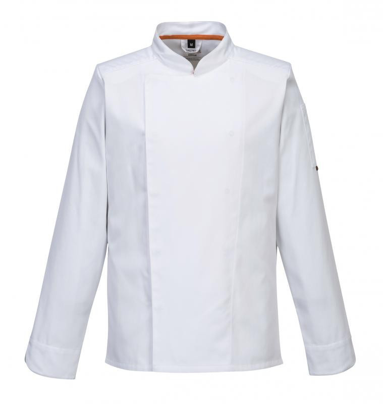 Ez a séf kabát ergonomikus viseletet és karcsú sziluettet biztosít. Dupla gombos rejtett záródás, kötény akasztó fül a nyak hátsó részén és nagy méretű MeshAir Pro panelek amik kiváló légáteresztést biztosítanak. Külső anyag: Kingsmill anyag Texpel bevonattal 190g. Kontraszt anyag: 100% poliészter háló 140g. Jellemzők: MeshAir™ szellőző hálós szövet - a hónalj részen - a nagyobb lélegzőképesség érdekében. Tartós poliészter/pamut szövet Texpel folttaszító bevonattal. Mosás után megtartja méretét. 1 zseb a biztonságos tárolás érdekében. Slim fit design a kivételes komfortért. A külső akasztófül biztosítja a kötény biztonságos elhelyezését.