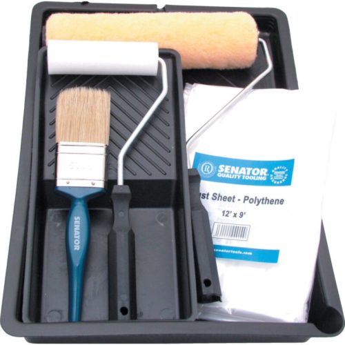 • Festőkészlet emulziós és fényes festékekhez: mini festőhenger + tartalék henger, 50 mm-es ecset, festéklehúzó tálca és 3.70 x 2.80 m-es polietilén takarófólia.