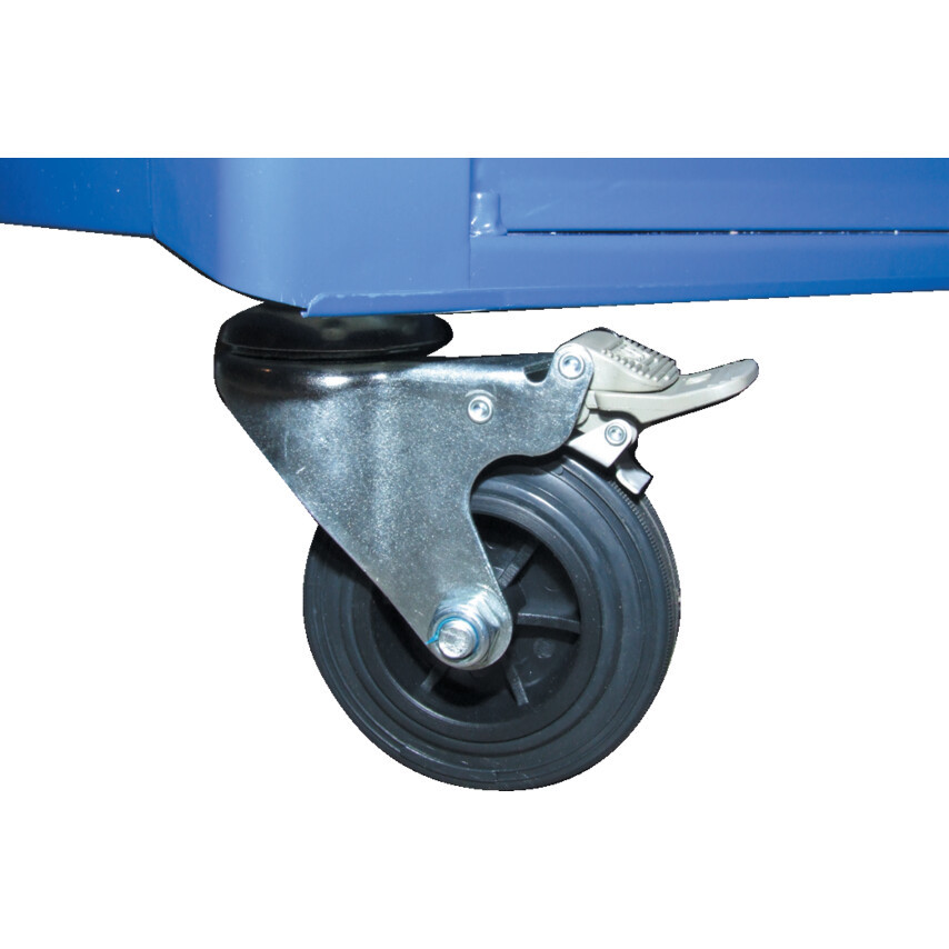 1mm vastag acéllapokból készült 0.8mm vastag acéllemez fiókokkal. Kétrészes epoxy bevonatos kék/szürke felület. Szivacsbetétes, teljesen kihúzható fiókok, krómozott alumínium fogantyúkkal. 350mm hosszú, gyorskioldós görgős csúszósínek. Fedőszönyeg. 100x25mm átmérőjű erős gumikerekek. Hátsó kerekek fékkel szerelve. 450mm széles irányítókar.Teljesen zárható kivitel. A fiókok terhelését ajánlott egyenletesen szétosztani. Mozgatáskor csak tolni szabad