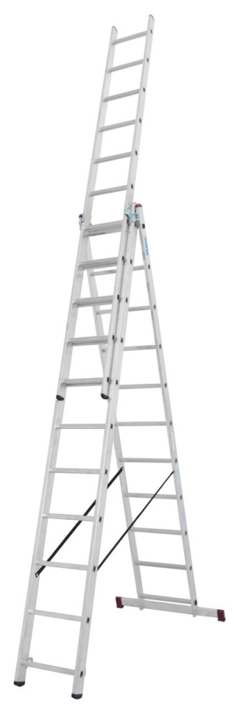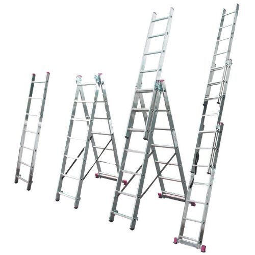 Háromrészes, sokoldalúan használható alumínium sokcélú létra. Használható támasztó-, álló- és tolólétraként is.