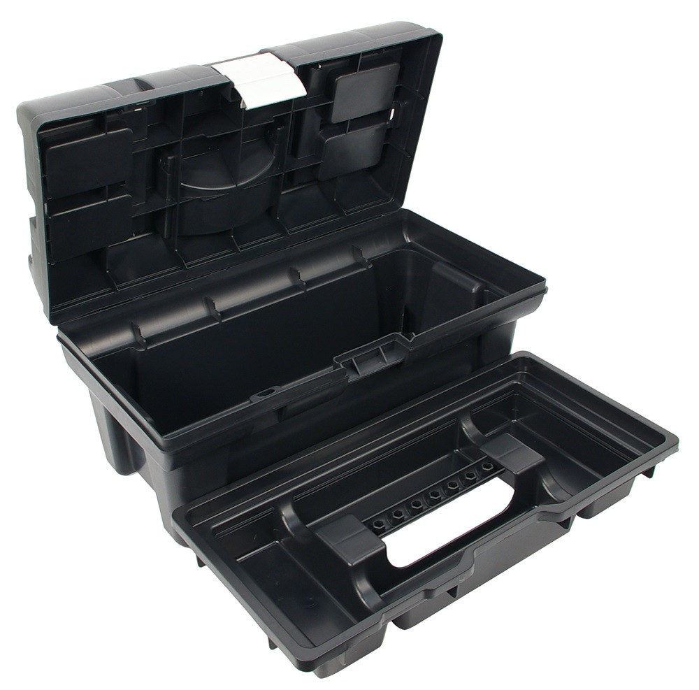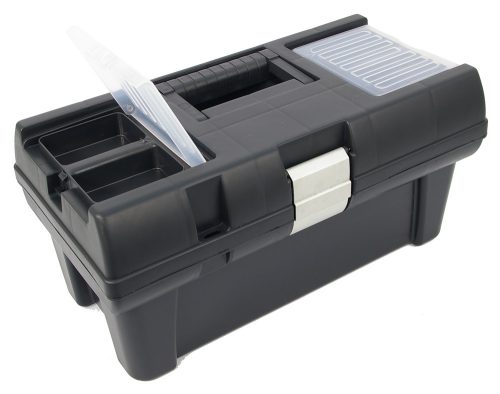 Szerszámosláda, műanyag, alucsatos, tálcával, fekete, lakatolható; 16", 415×220×200mm, rendező felül