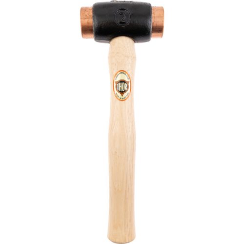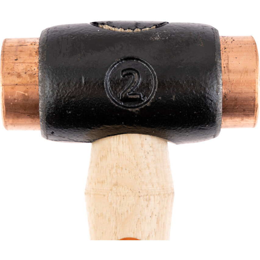 Kovácsolt vas fej tiszta elektrolitréz betétekkel nagy erejű ütésekhez. Tömör fanyél.