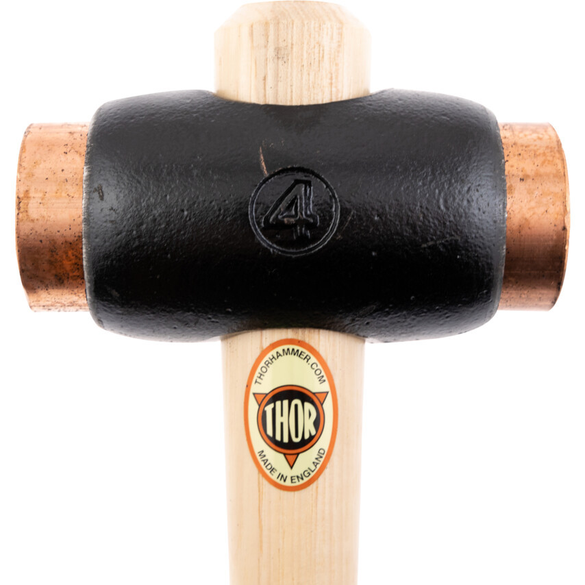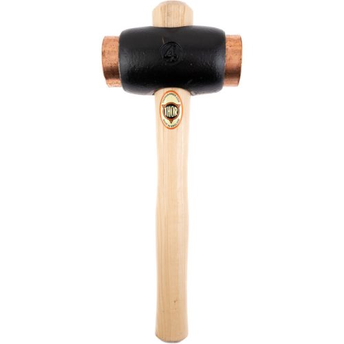 Kovácsolt vas fej tiszta elektrolitréz betétekkel nagy erejű ütésekhez. Tömör fanyél.