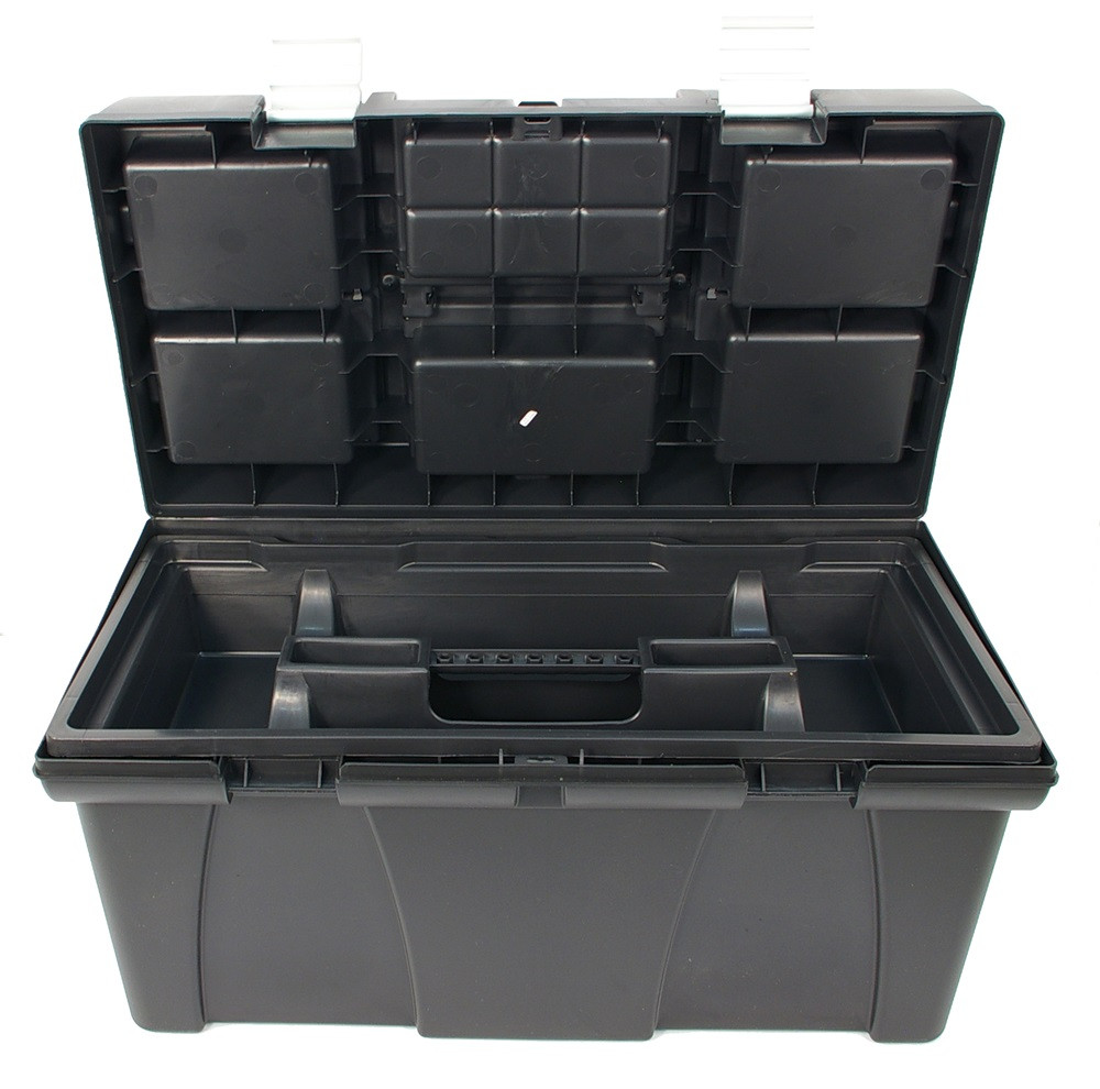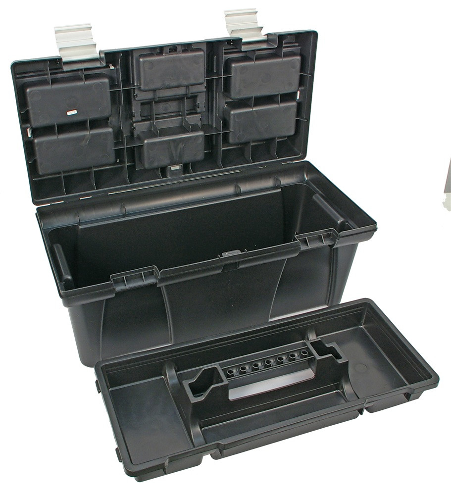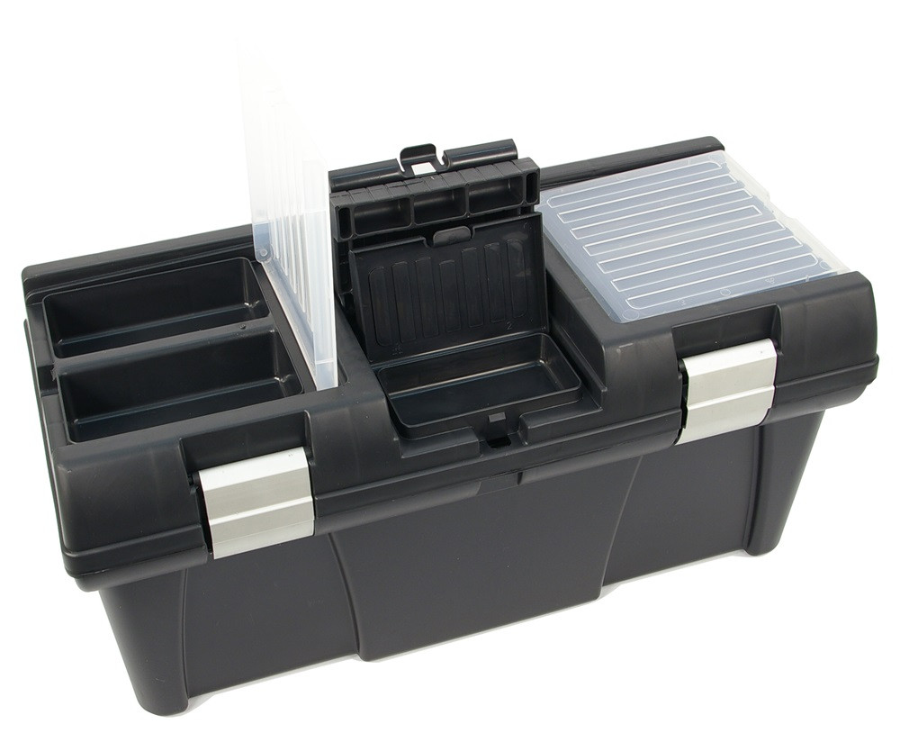Szerszámosláda, műanyag, alucsatos, tálcával, fekete, lakatolható; 20", 525×255×245mm, rendező felül