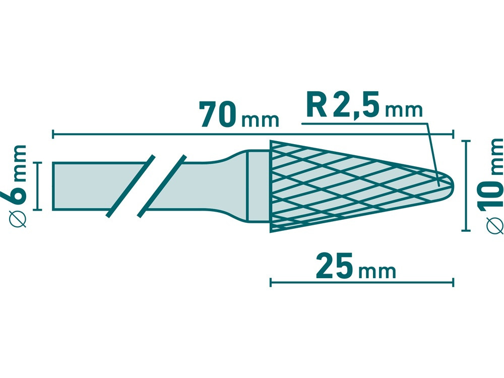 EXTOL INDUSTRIAL keményfém turbómaró (rotormaró), kúpos, kerek orrú, átmérő 10×25mm/szár 6mm, keresztfogazás