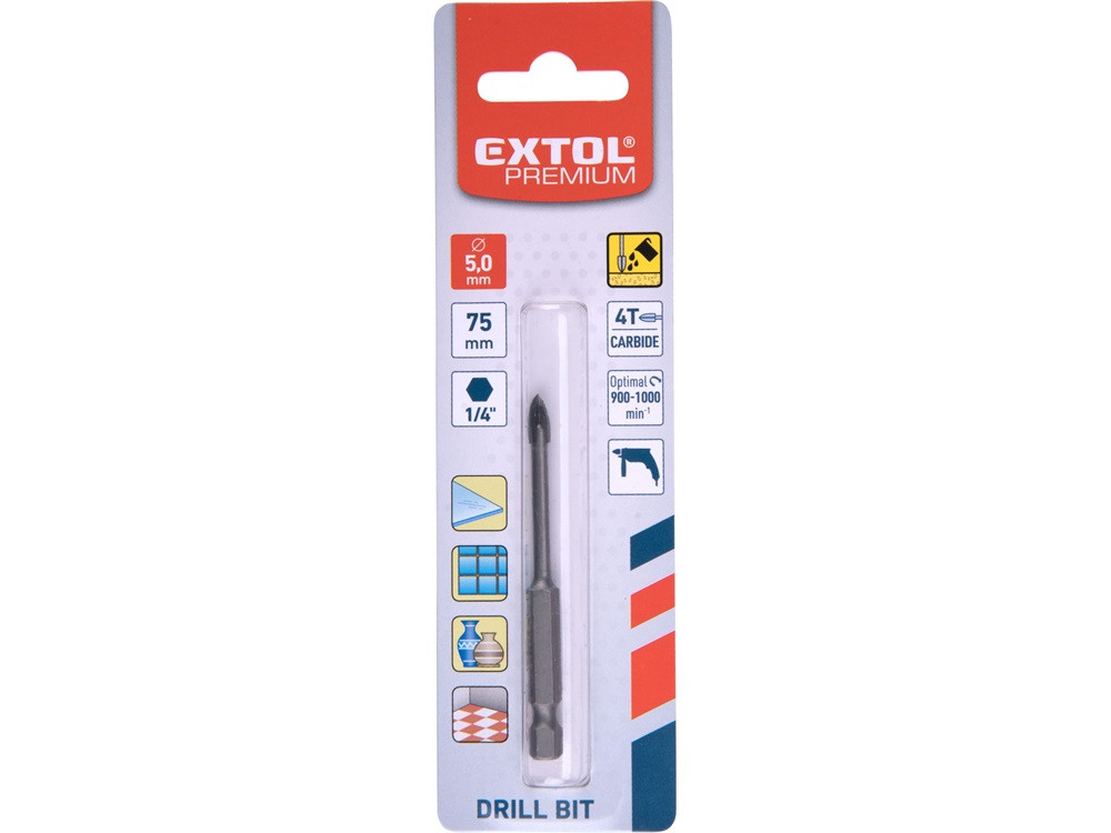 EXTOL PREMIUM fúró üvegre, kerámiára és csempére, keményfém lapkás; 5×75mm, 1/4" hatszög befogás