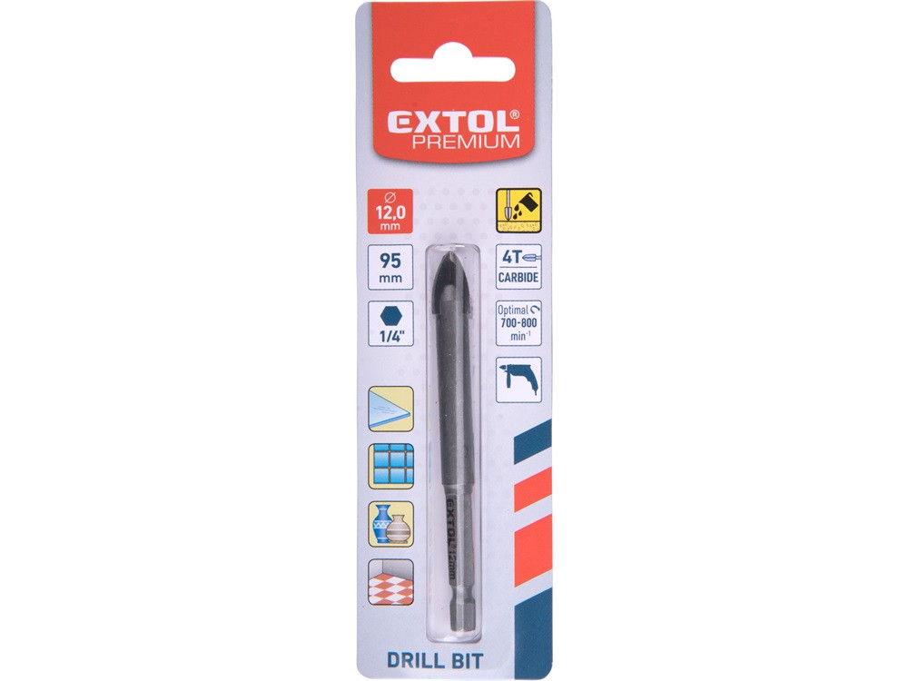 EXTOL PREMIUM fúró üvegre, kerámiára és csempére, keményfém lapkás; 12×95mm, 1/4" hatszög befogás