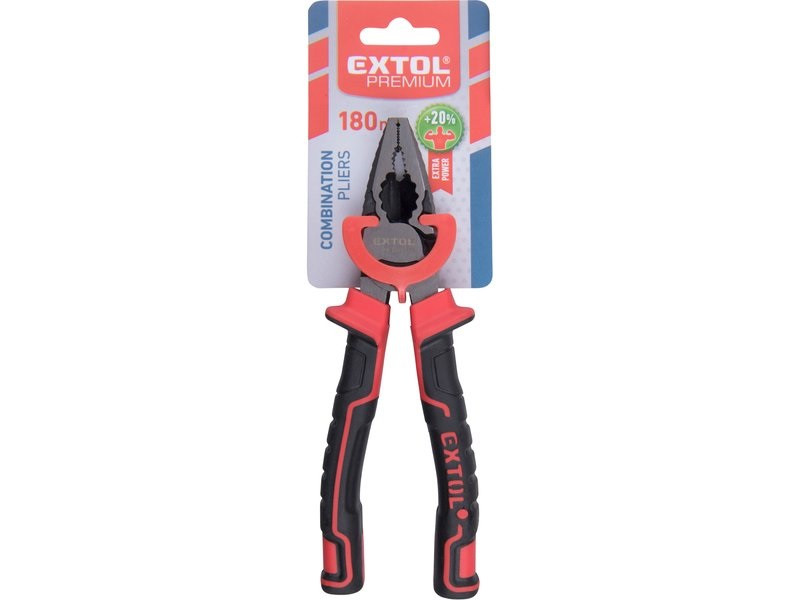 EXTOL PREMIUM  kombinált fogó, 180mm, duál vörös/fekete TPR nyél, 20% extra erőkifejtés, akasztós szerszámtartó