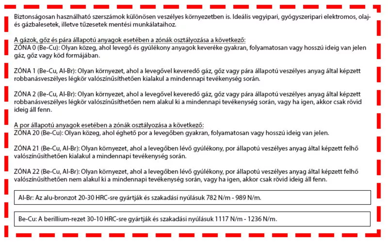 • Ezek a szerszámok a normál kivitelű szerszámokkal ellentétben nem képeznek szikrát kemény felülethez történő ütés következtében.